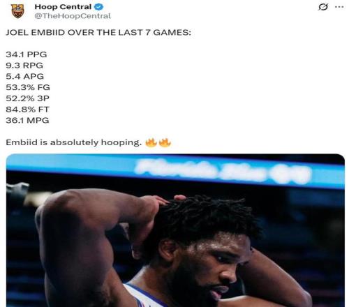 无惧乔治禁赛25场!恩比德狂轰40+11梦回巅峰率队14战10胜高歌猛进,超级探花也因祸得福获得更多机会。