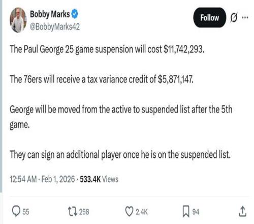 除此之外,乔治被禁赛还让76人队将获得超过587万美元的奢侈税减免,将原本700万美元左右的奢侈税直接降至126万左右,后续还可以交易掉部分角色球员直接降至奢侈税线以下,从而作为非奢侈税球队参与奢侈税分红。