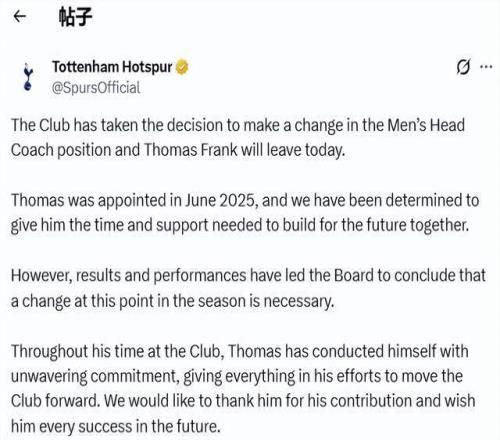 去年夏天,弗兰克正式担任热刺主帅,签约至2028年夏天。执教热刺不到1年,弗兰克带队38场比赛,成绩是13胜10平15负。尽管热刺在英超表现令人失望,但在欧冠,热刺8场17分高居第4位,拿到直通16强席位。