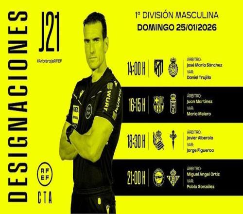 西班牙足协官方公布了周日西甲四场比赛的裁判安排,胡安-马丁内斯将执法巴萨vs皇家奥维耶多。