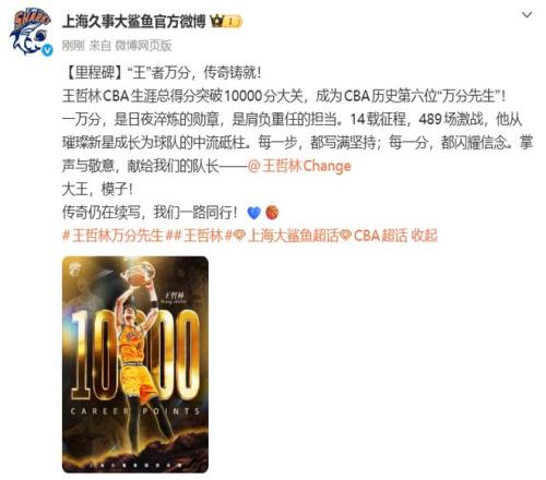 32岁王哲林CBA生涯总得分突破10000分,成为CBA历史第六位“万分先生”,上海队官博祝贺:大王,模子!