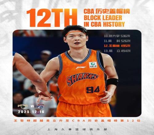 本赛季CBA常规赛第2轮,上海久事客场挑战南京天之蓝。王哲林在第二节送出个人第2次盖帽,CBA生涯盖帽总数上升至495次,超越易立的494次,升至CBA历史盖帽榜第12位。